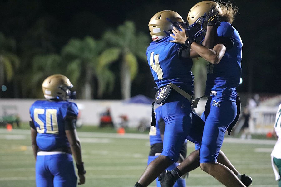 Christian Cooper (4) celebrates with Mainland quarterback Sebastian Johnson after Johnson scored on a 1-yard run to give the Bucs a 21-7 lead early in the third quarter. Photo by Brent Woronoff