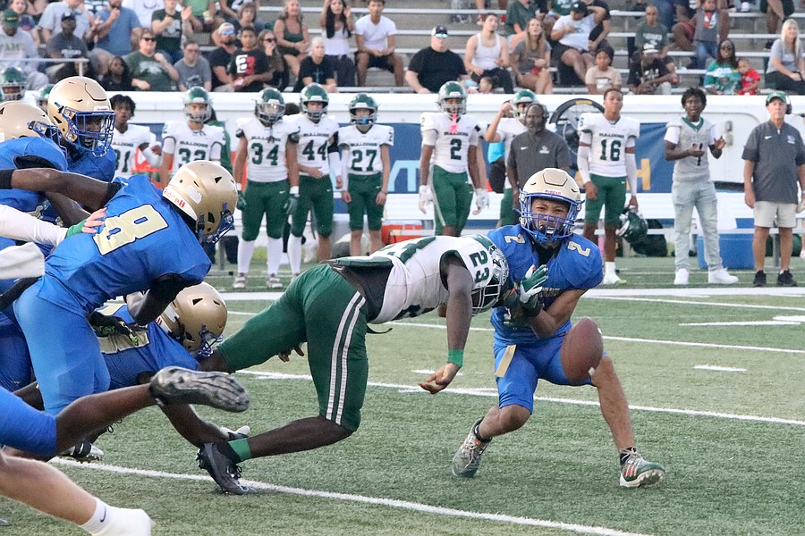 FPC running back Ehimen Ajede (23) fumbles as he is tackled and collides with Marcus Day (2). Kiarin Sullivan (8) would recover for the Bucs. Photo by Brent Woronoff