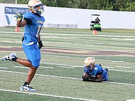 Mainland's Kadin Flores runs after making a catch in the second quarter. Photo by Brent Woronoff