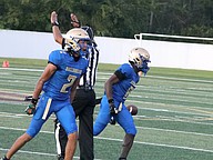 Mainland's Marcus Day (2) celebrates a fumble recovery by Kiarin Sullivan (8). Photo by Brent Woronoff