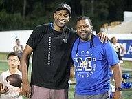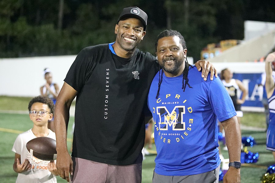 Basketball Hall of Famer Vince Carter (left) and Bucs basketball coach (and Carter's former Mainland teammate) Joe Giddens watched the game from the sideline. Carter's son, Vincent, tosses a football in the background. Photo by Brent Woronoff
