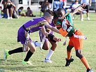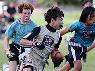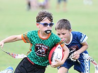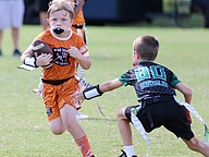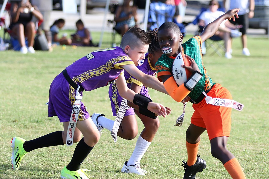 LSU’s Declan Morgan, left, goes for the flag of Hurricanes player Jaden Williams, right, in the 10U division of the Mad Dogs Flag Football season opener. Photo by Christine Rodenbaugh