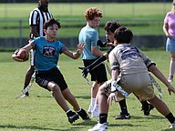 Knights 10U Christian Pimentel turns the corner in Saturday’s season opener of the Mad Dogs Flag Football league at Ralph Carter Park in Palm Coast. Photo by Christine Rodenbaugh