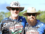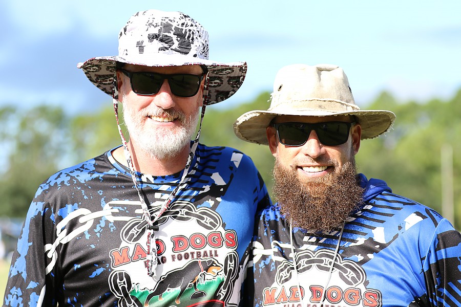 Jay Maxwell, right, president of the Mad Dogs Flag Football league, and John King, director, wear the league's custom jerseys. Maxwell coached flag football for eight years before bringing Mad Dogs to Palm Coast. Photo by Christine Rodenbaugh