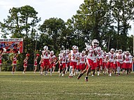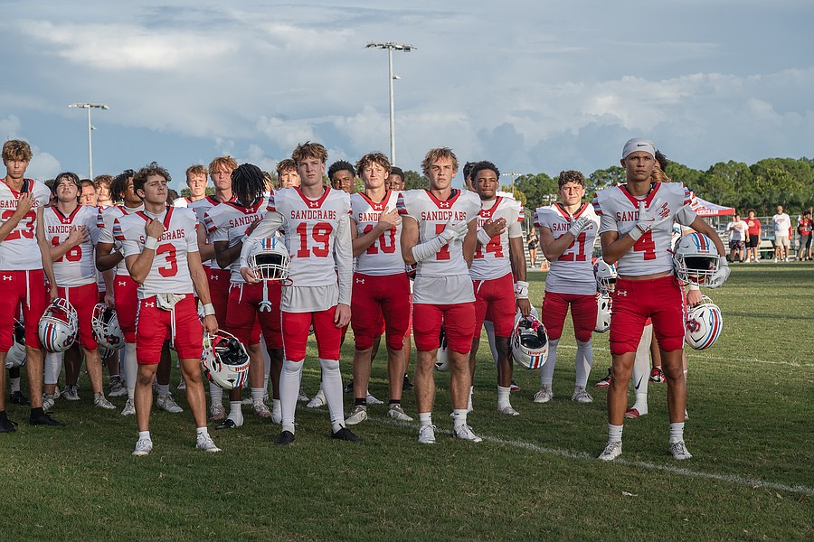 The Seabreeze football team honors the flag during the playing of the national anthem before the game against Halifax Academy on Friday, Sep. 5 at the Ormond Beach Sports Complex. Photo by Michele Meyers