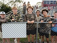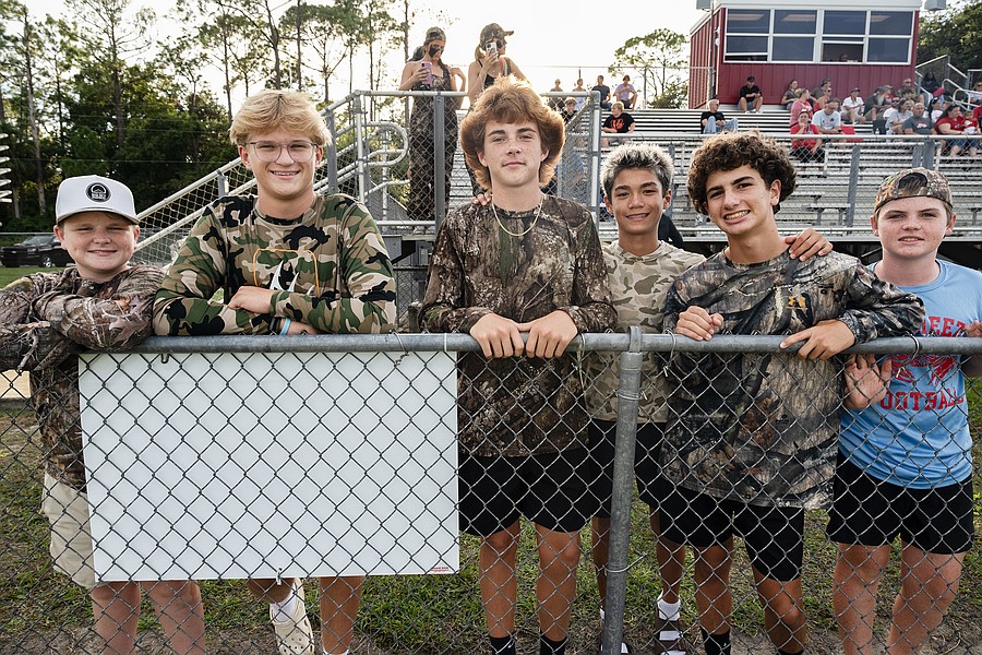 It is camo night for Seabreeze fans (left to right) Jesse Colley, Luke Clayton, Zaydin Keeler, Luke Gildon, Baker Kelso and Finn Kimble at the game against the Halifax Academy on Friday, Sep. 5 at the Ormond Beach Sports Center. Photo by Michele Meyers