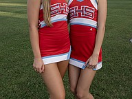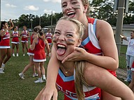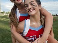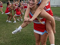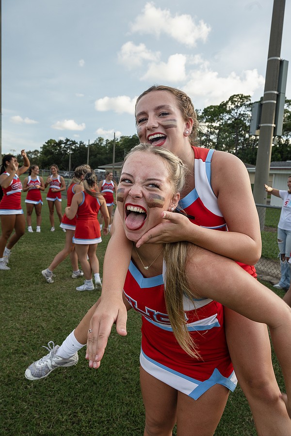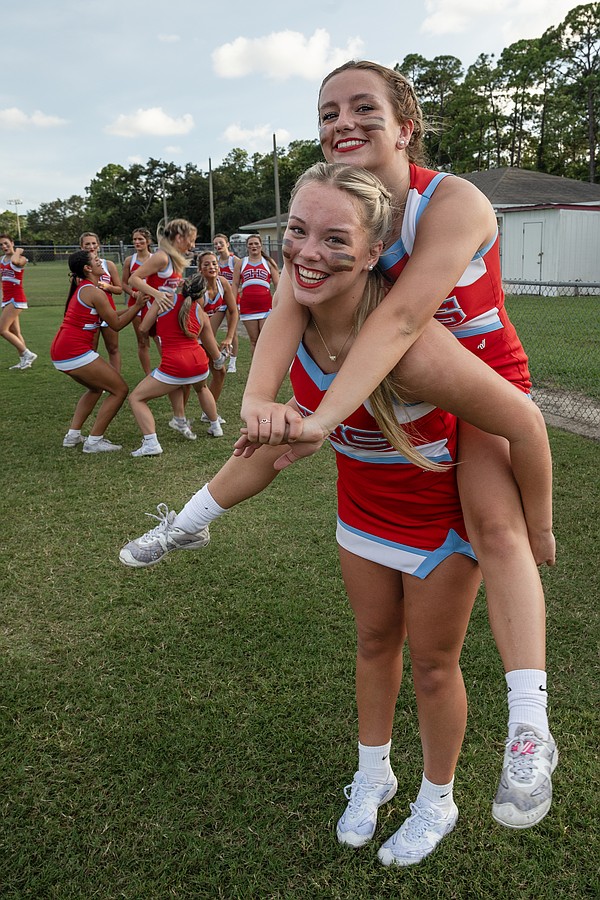 Seabreeze cheerleaders Sarah Sanblom (top) and Taylor Bowman have a little fun before the game against Halifax Academy on Friday, Sep. 5 at the Ormond Beach Sports Complex. Photo by Michele Meyers