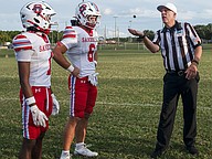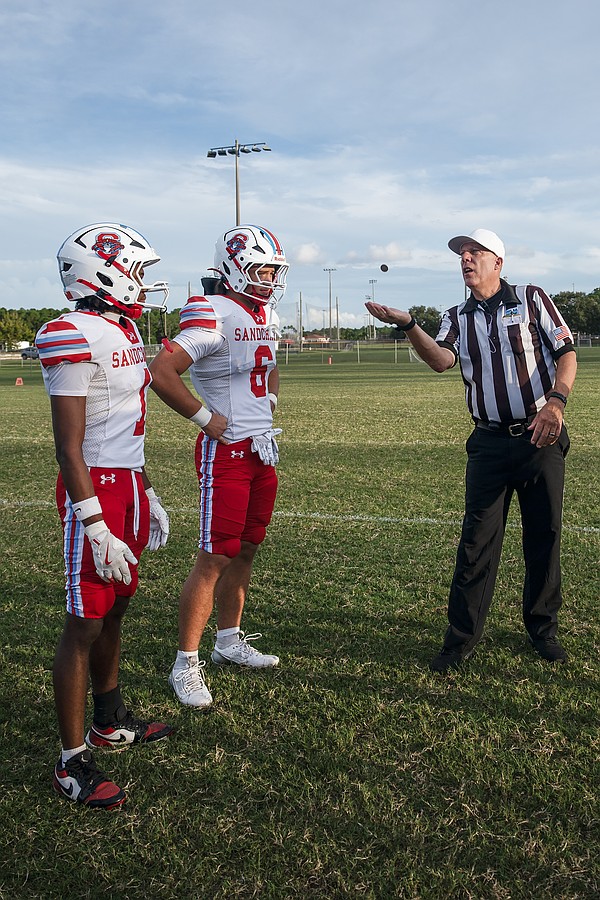 Seabreeze team captains Zach Voltaire (left) and Logan Smith (center) wait for the coin toss by an FHSAA official at the game against Halifax Academy on Friday, Sep.5 at the Ormond Beach Sports Complex. Photo by Michele Meyers