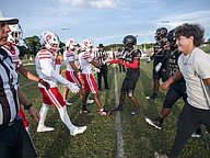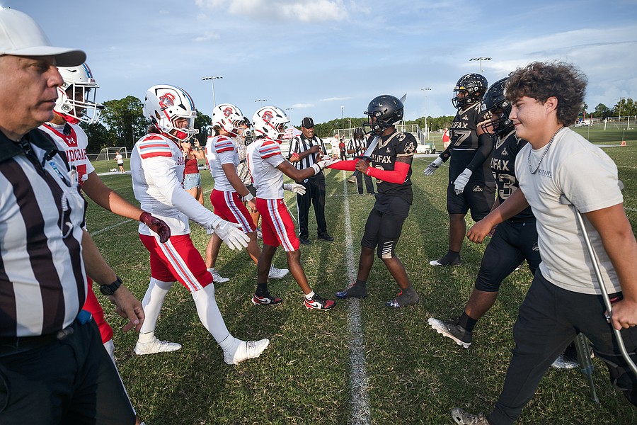 Seabreeze and Halifax Academy shake hands before the game on Friday, Sep. 5 at the Ormond Beach Sports Complex. Photo by Michele Meyers