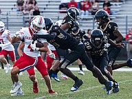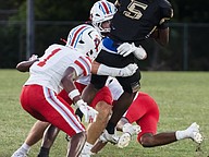 It takes an army of Knights to take down Seabreeze running back Logan Smith (right) on Friday, Sep. 5 at the Ormond Beach Sports Complex. Photo by Michele Meyers