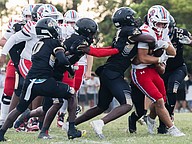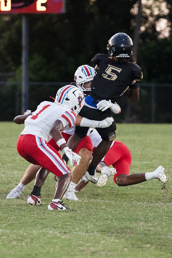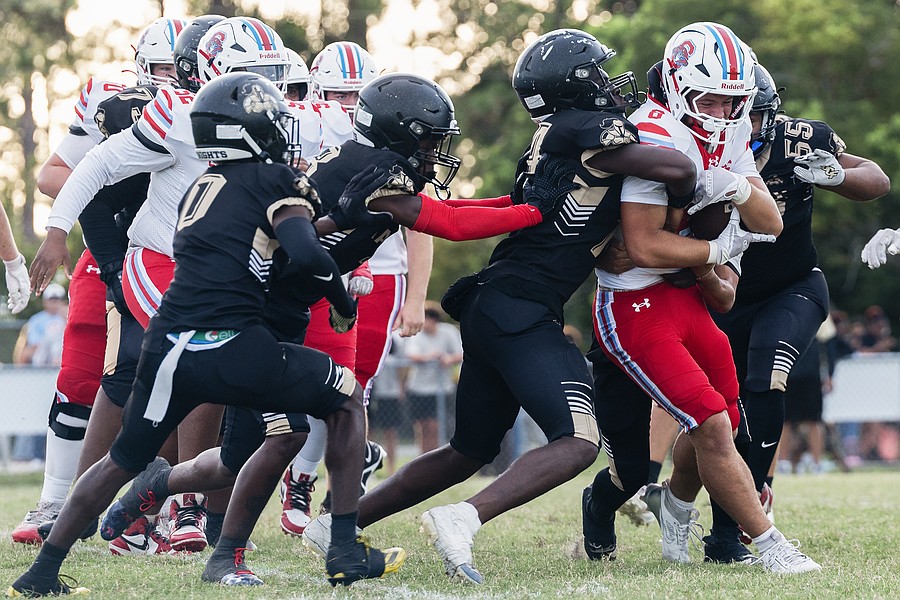 Seabreeze's Stephen Williams Jr. (center right) puts some spin action on as Halifax Academy quarterback Tre'Mari Denis (center left) makes the tackle and teammates Jerome Hutchins (77) and Drew Cleveland (50) run in to assist on Friday, Sep. 5 at the Ormond Beach Sports Complex. Photo by Michele Meyers