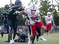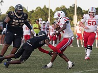 Seabreeze's Owen O'Rourke (5) breaks free of a tackle by Halifax Academy's 6'4", 290 lbs. Jerome Hutchins on Friday, Sep. 5 at the Ormond Beach Sports Complex. Photo by Michele Meyers