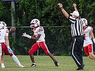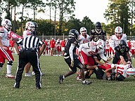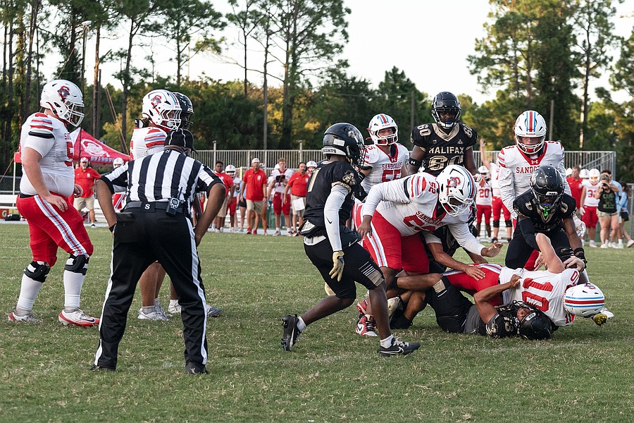 An FHSAA official watches closely as Seabreeze linebacker Tristian Miller (10) lands on the 1-yard line during the game against Halifax Academy on Friday, Sep.5 at the Ormond Beach Sports Complex. Photo by Michele Meyers