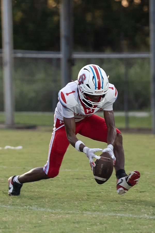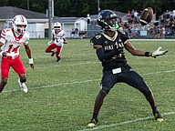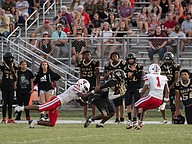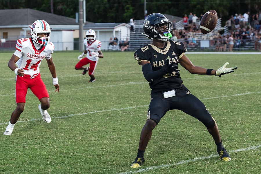 Halifax Academy's Johntae Haddocks (right) goes in for the catch as Demarion Pompey (14) moves in on Friday, Sep. 5 at the Ormond Beach Sports Complex. Photo by Michele Meyers