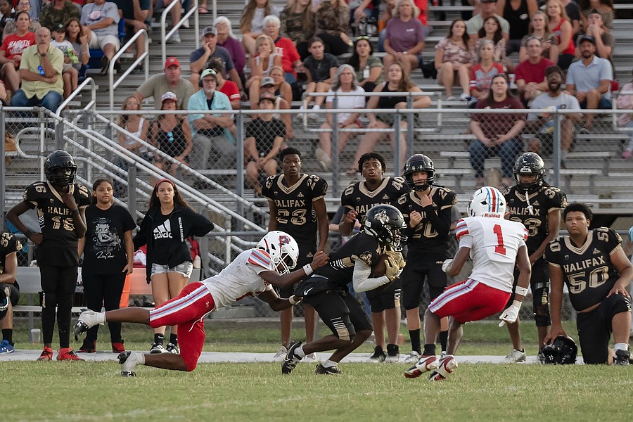 Seabreeze's Stephen Williams Jr. (left) tackles one of Halifax Academy's wide receivers following a pass reception on Friday, Sep. 5 at the Ormond Beach Sports Complex. Photo by Michele Meyers