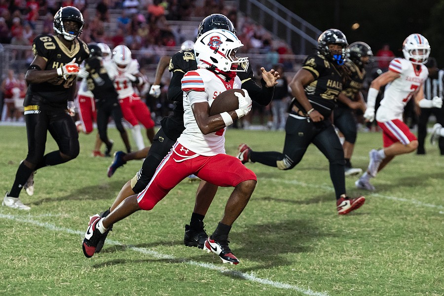 Seabreeze running back Zach Voltaire outruns a multitude of Halifax Academy players during the game against Halifax Academy on Friday, Sep. 5 at the Ormond Beach Sports Complex. Photo by Michele Meyers