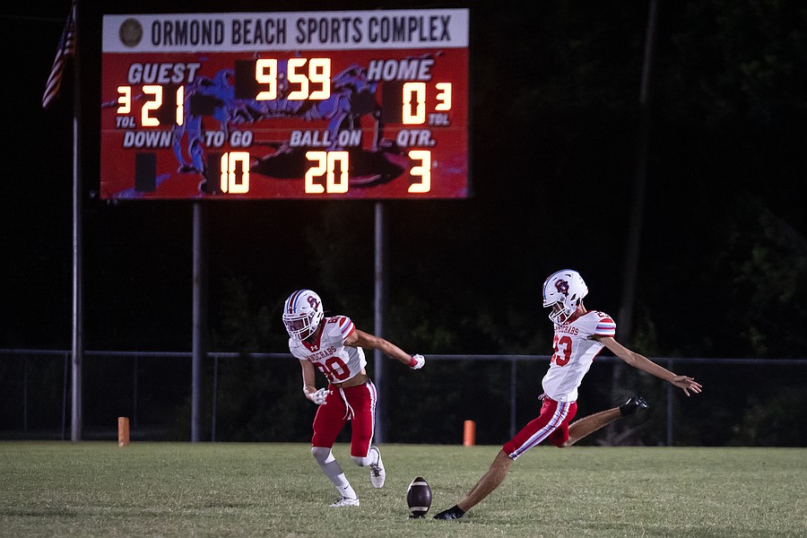 Seabreeze kicker Luke Zboch (right) punts during the game against Halifax Academy on Friday, Sep. 5 at the Ormond Beach Sports Complex. Photo by Michele Meyers