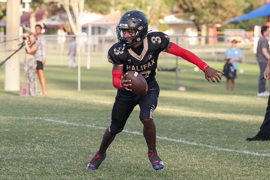 Seabreeze captain Zach Voltaire (1) runs in for a touchdown against Halifax Academy on Friday, Sep. 5 at the Ormond Beach Sports Complex. Photo by Michele Meyers