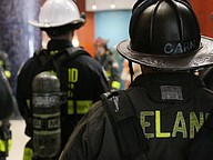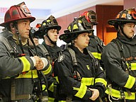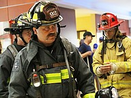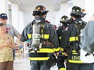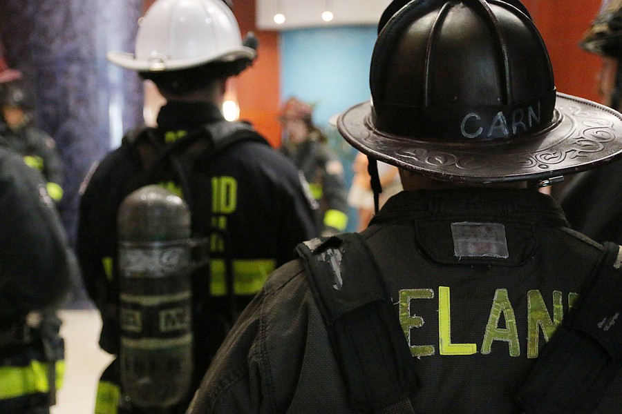 Firefighters listen to instruction during the 9/11 memorial stair climb. Photo by Jarleene Almenas