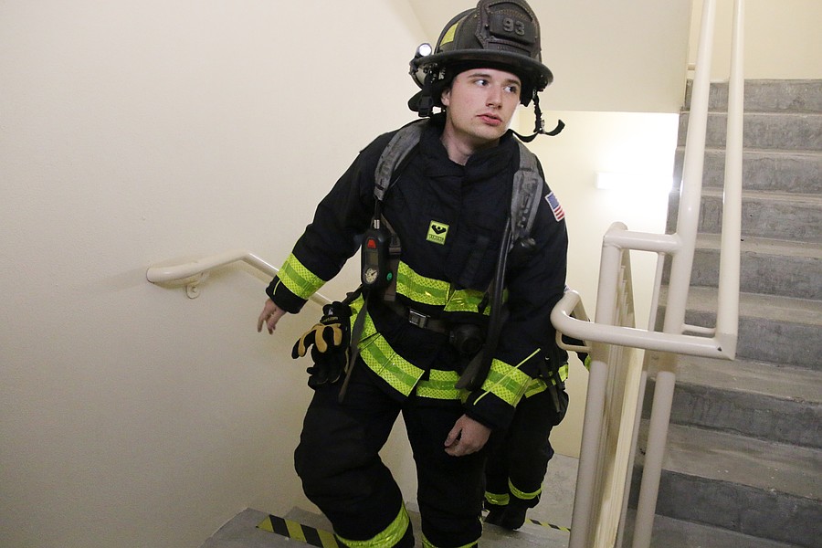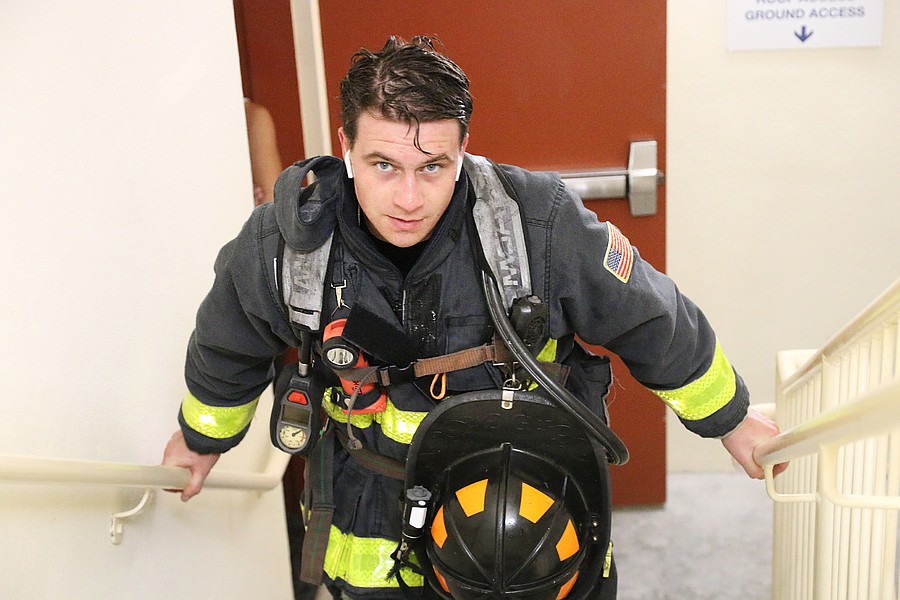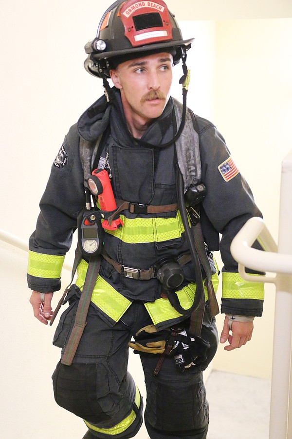 Ormond Beach probationary firefighter Drake Goodman takes part in the 9/11 memorial stair climb. Photo by Jarleene Almenas