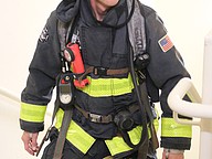 Ormond Beach Driver Engineer Robert Zalewski (right) gears up for the 9/11 memorial stair climb. Photo by Jarleene Almenas