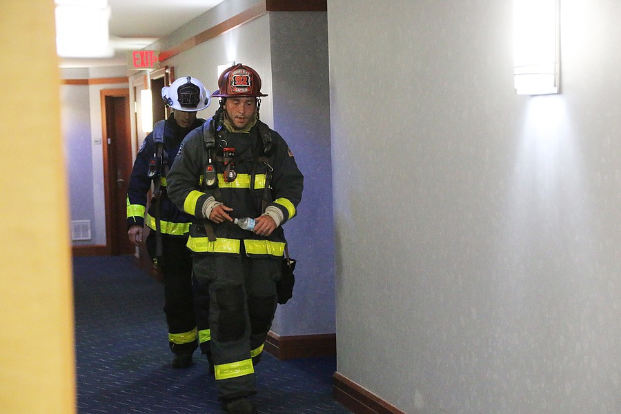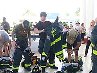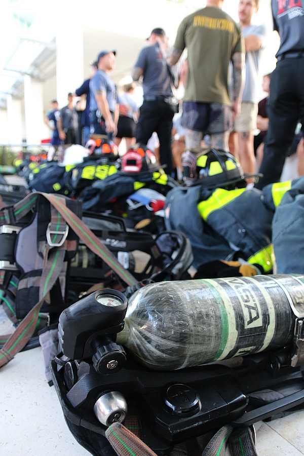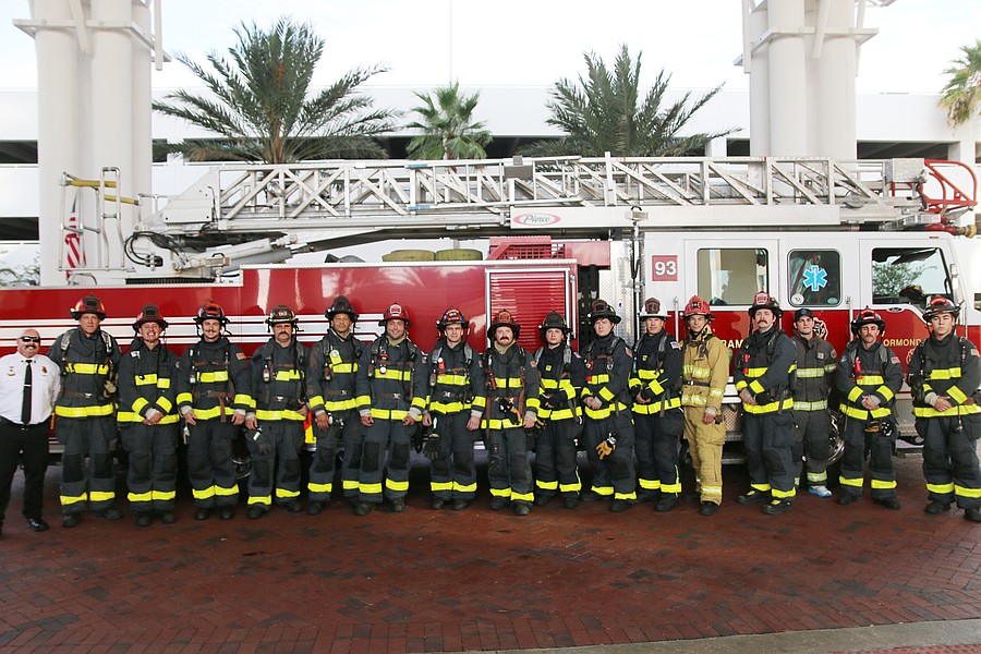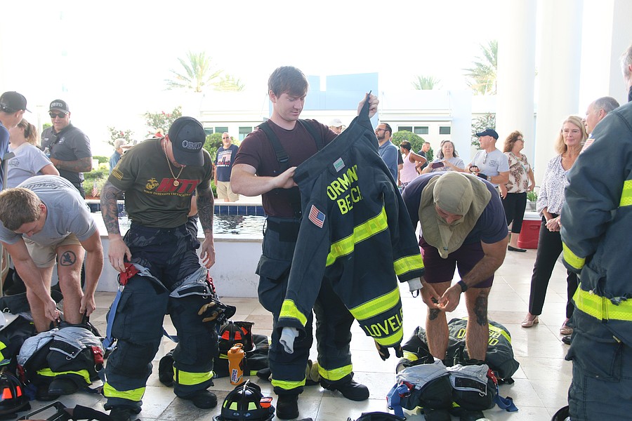 Ormond Beach firefighters enter the Marina Grande on the Halifax condominiums to begin the 9/11 memorial stair climb. Photo by Jarleene Almenas