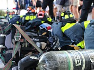 Ormond Beach firefighters organize their gear ahead of the the 9/11 memorial stair climb at the Marina Grande on the Halifax condominiums. Photo by Jarleene Almenas