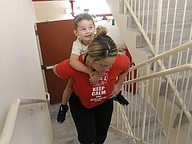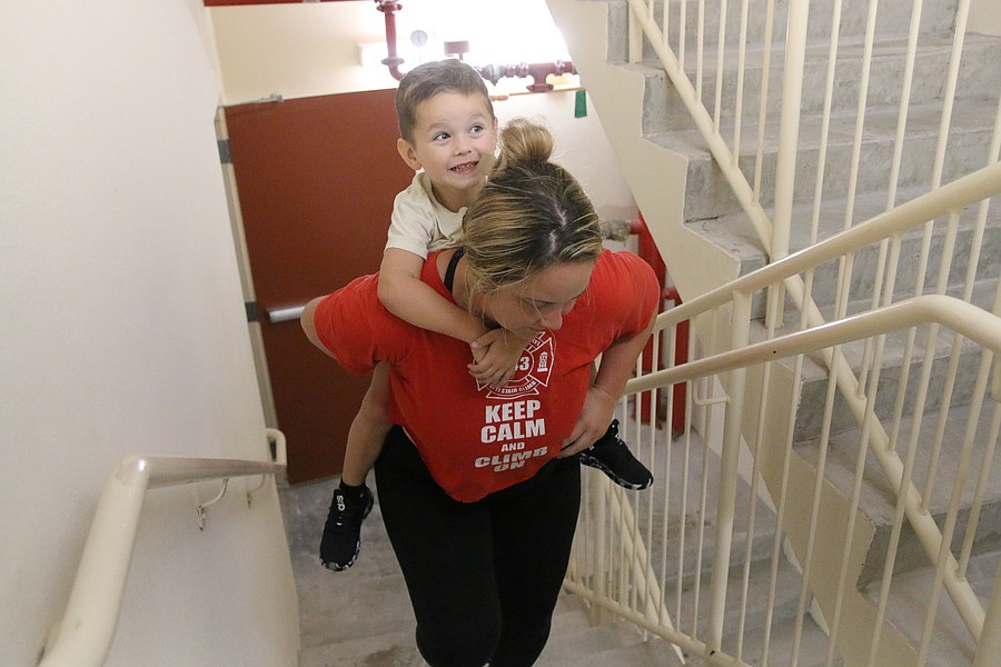 Autumn Zalewski and son Gunnar take part in the 9/11 memorial stair climb. Photo by Jarleene Almenas