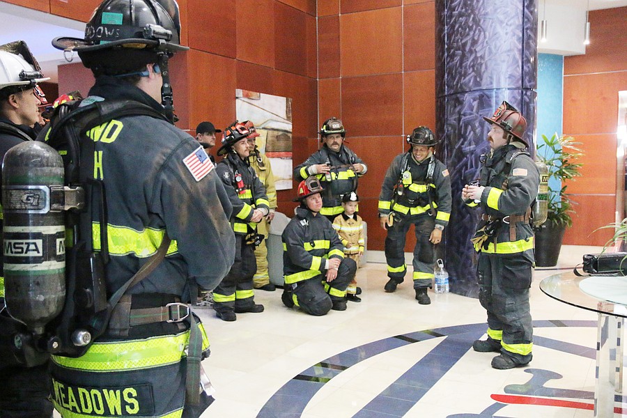 Capt. Hunter Ramirez (right) speaks to firefighters before beginning the 9/11 memorial stair climb. Photo by Jarleene Almenas