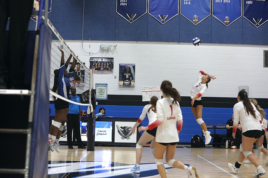 Seabreeze's Baylee Brown hits over the net. Photo by Brent Woronoff