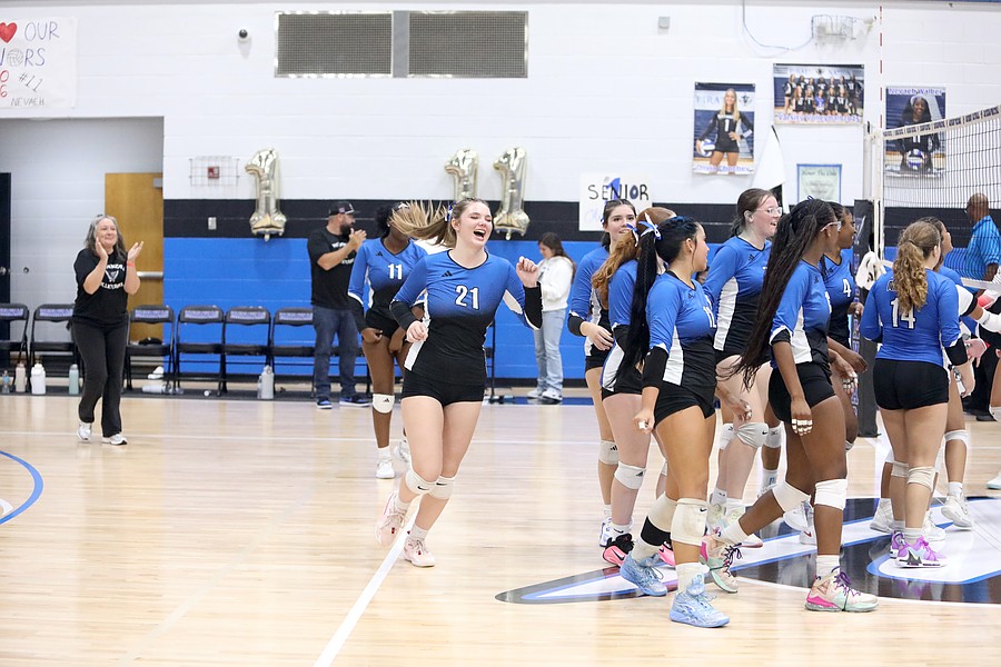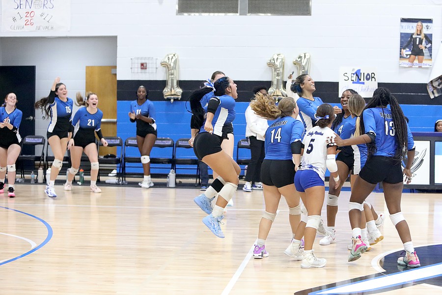 Matanzas players celebrate the four-set victory over Seabreeze. Photo by Brent Woronoff