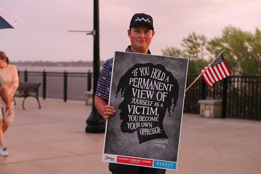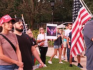 Timo Hogan, Suzanne Engel and Cage Barton attend a vigil in memory of Charlie Kirk at Cassen Park on Friday, Sept. 12. Photo by Jarleene Almenas