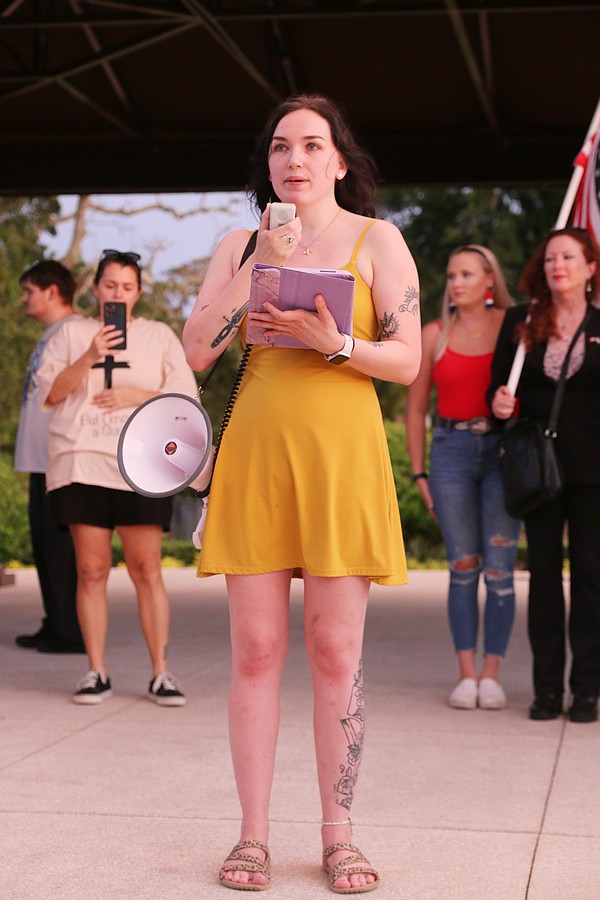 Markala Oman, who organized the event, speaks to the crowd at Rockefeller Gardens before walking the Granada bridge in memory of Charlie Kirk on Friday, Sept. 12. Photo by Jarleene Almenas