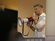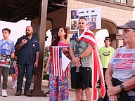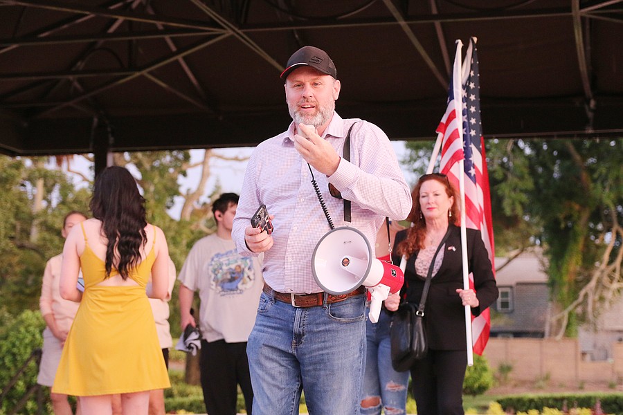 Travis Limbocker speaks during a vigil in memory of Charlie Kirk at Cassen Park on Friday, Sept. 12. Photo by Jarleene Almenas
