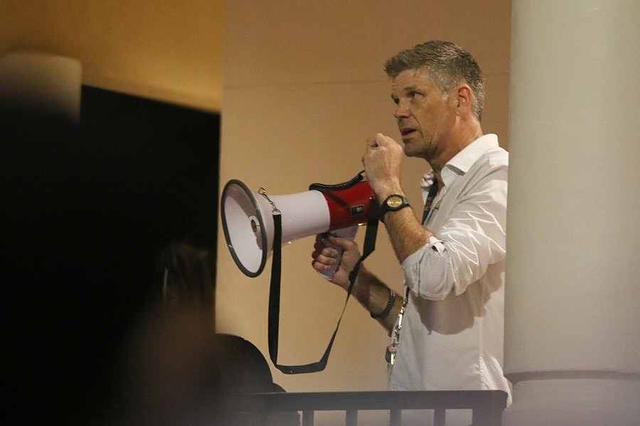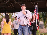 Ormond Beach Mayor Jason Leslie speaks to the crowd at Rockefeller Gardens in memory of Charlie Kirk on Friday, Sept. 12. Photo by Jarleene Almenas