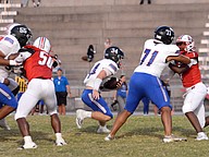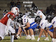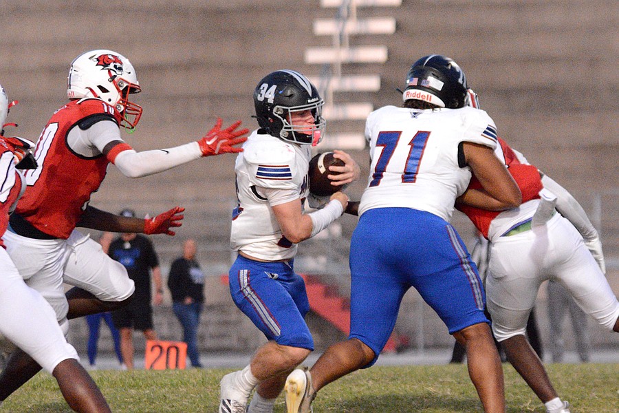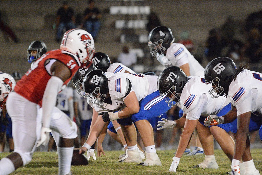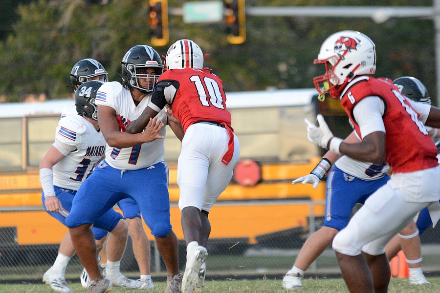 Matanzas lineman Anthony Williams blocks Jackson defensive end Amir Little (10). Photo by Hannah Hodge