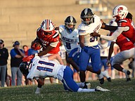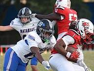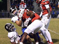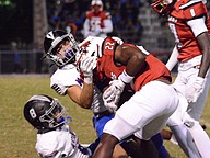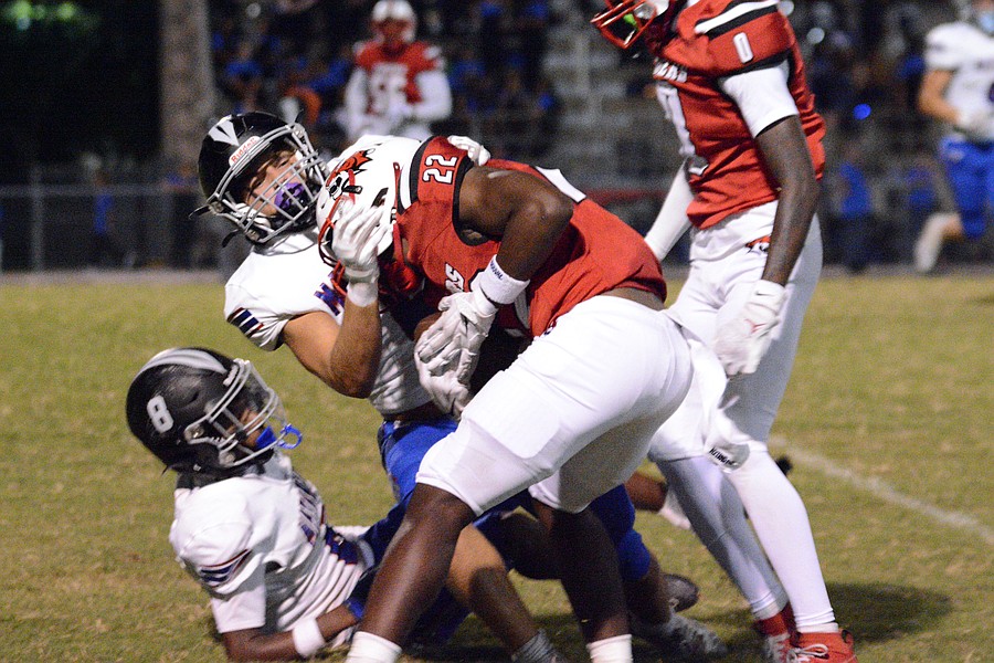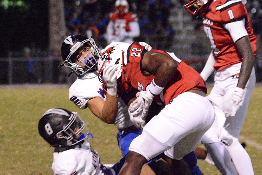 Matanzas linebacker Nick Yacono tackles Jackson's Jeremiah Hampton (22). Photo by Hannah Hodge