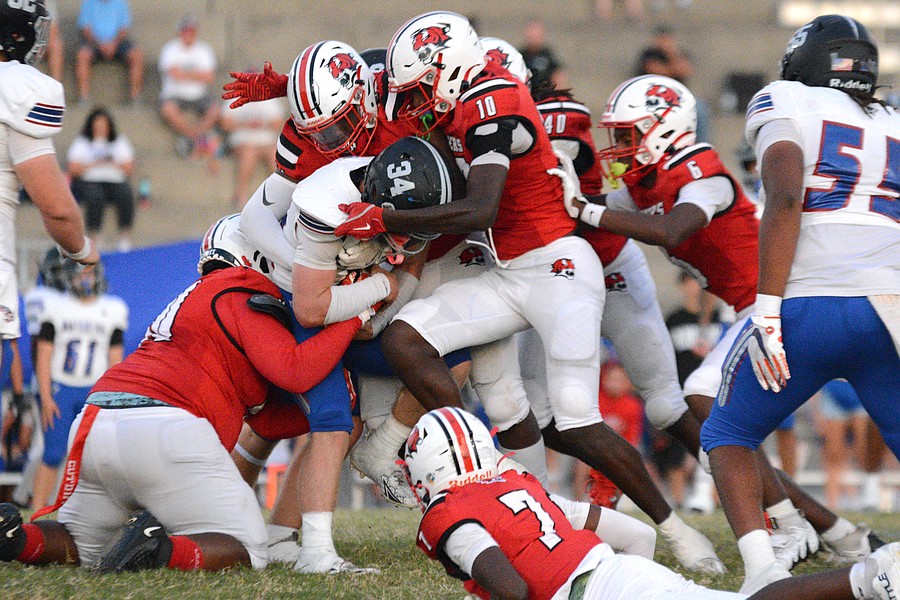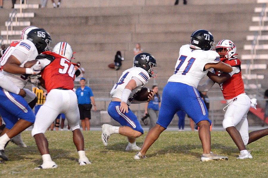 Matanzas running back Wiley Conner (34) tries to push through a host of Jackson defenders. Photo by Hannah Hodge. Conner rushed for 83 yards and two touchdowns and also caught a touchdown pass. Photo by Hannah Hodge