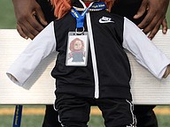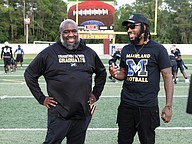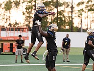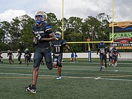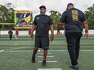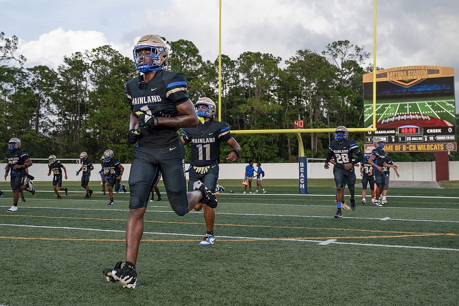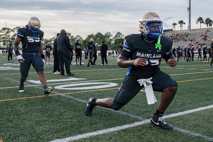Mainland linebacker Dennis "Tank" King III (left) warms up with the team before the game against Spruce Creek on Friday, Sept. 12 at the Daytona Stadium. Photo by Michele Meyers