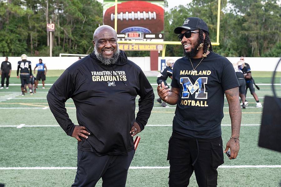 Sed Simmons (right) interviews Mainland head coach Jerrime Bell (left) before the game against Spruce Creek on Friday, Sept. 12 at the Daytona Stadium. Photo by Michele Meyers