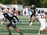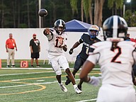 Spruce Creek quarterback P.J. Miller passes from the end zone on Friday, Sept. 12 at the Daytona Stadium. Photo by MIchele Meyers
