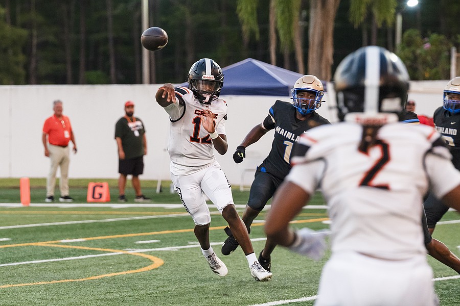 Mainland quarterback Sebastian Johnson (10) passes to wide receiver Kadin Flores (15) during the first quarter of the game against Spruce Creek on Friday, Sept. 12 at the Daytona Stadium. Photo by Michele Meyers