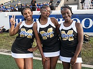 Mainland cheerleaders (left to right) Audriana Hall, Michyah Hickley and Sakinah Braswell get ready for the big game against Spruce Creek on Friday, Sept. 12 at the Daytona Stadium. Photo by Michele Meyers