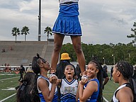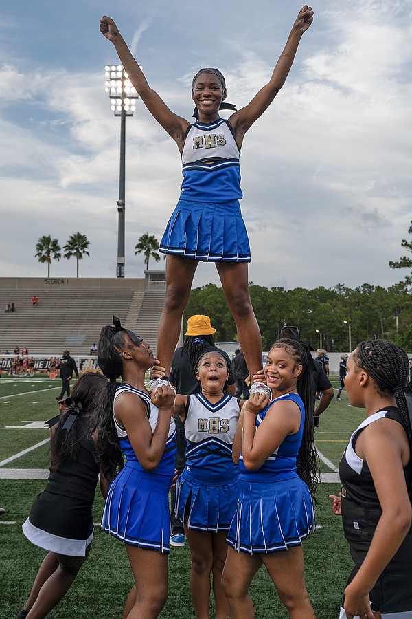 Mainland cheerleaders (bottom left to right) Ja'Maine Jackson, Assata Jamerson, Journi Latson and Paris Duffie (top) warm-up before the big game against Spruce Creek on Friday, Sept. 12 at the Daytona Stadium. Photo by Michele Meyers