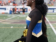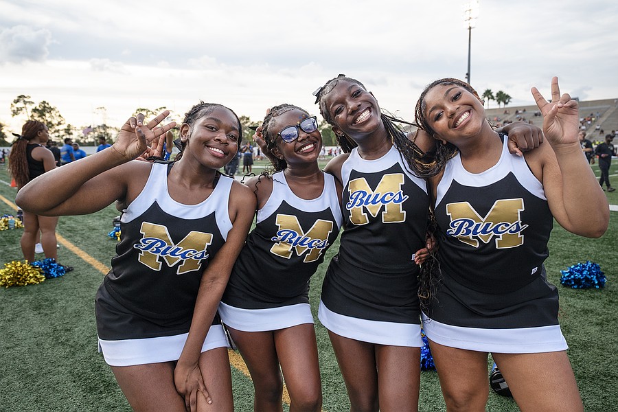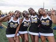 Mainland cheerleaders (left to right) Ja'Naylah Taylor, Destinee Hines, Natalie Williams and Aleaja Lopez warm-up before the big game against Spruce Creek on Friday, Sept. 12 at the Daytona Stadium. Photo by Michele Meyers
