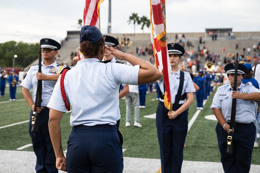The Mainland AF JROTC presents the colors before the game against Spruce Creek on Friday, Sept. 12 at the Daytona Stadium. Photo by Michele Meyers