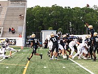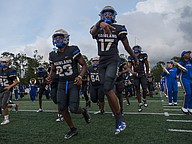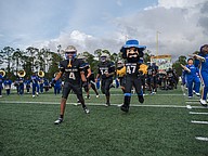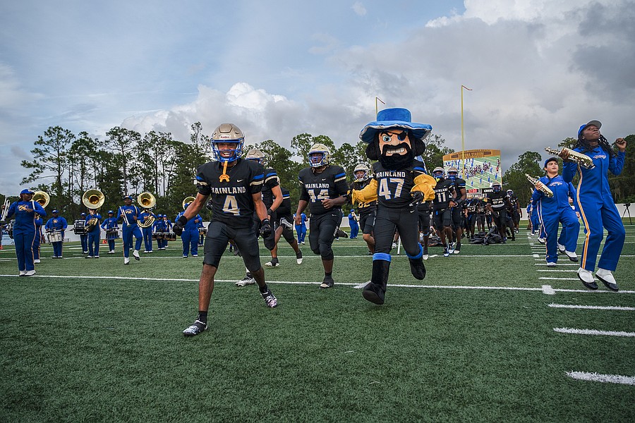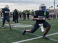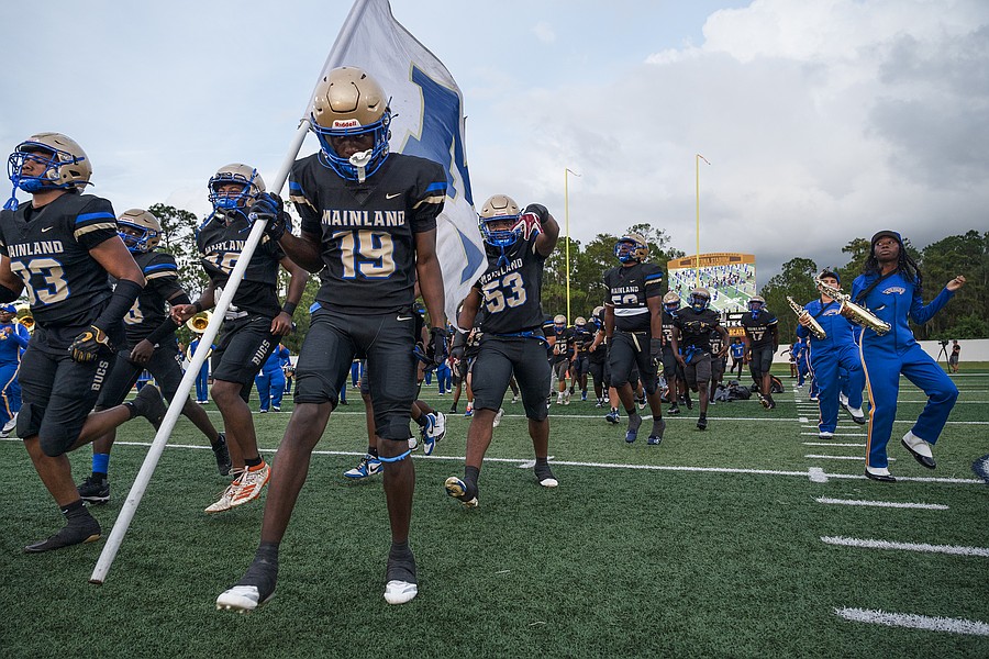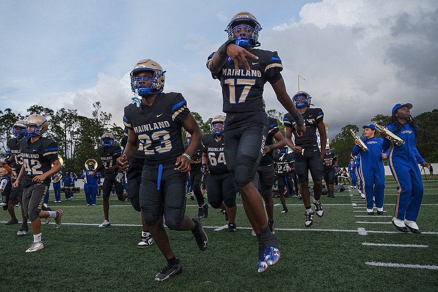Mainland's Josh Dudley (23) and Malcolm McArthur (17) run the field with their teammates before the game against Spruce Creek on Friday, Sept. 12 at the Daytona Stadium. Photo by Michele Meyers