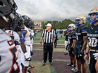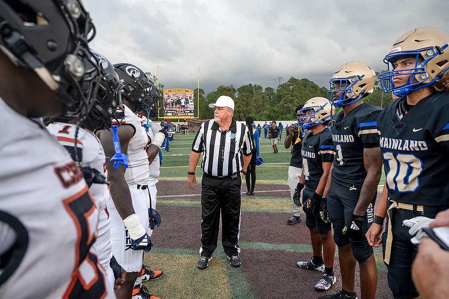 Mainland and Spruce Creek captains meet for the coin toss before game time on Friday, Sept. 12 at the Daytona Stadium. Photo by Michele Meyers