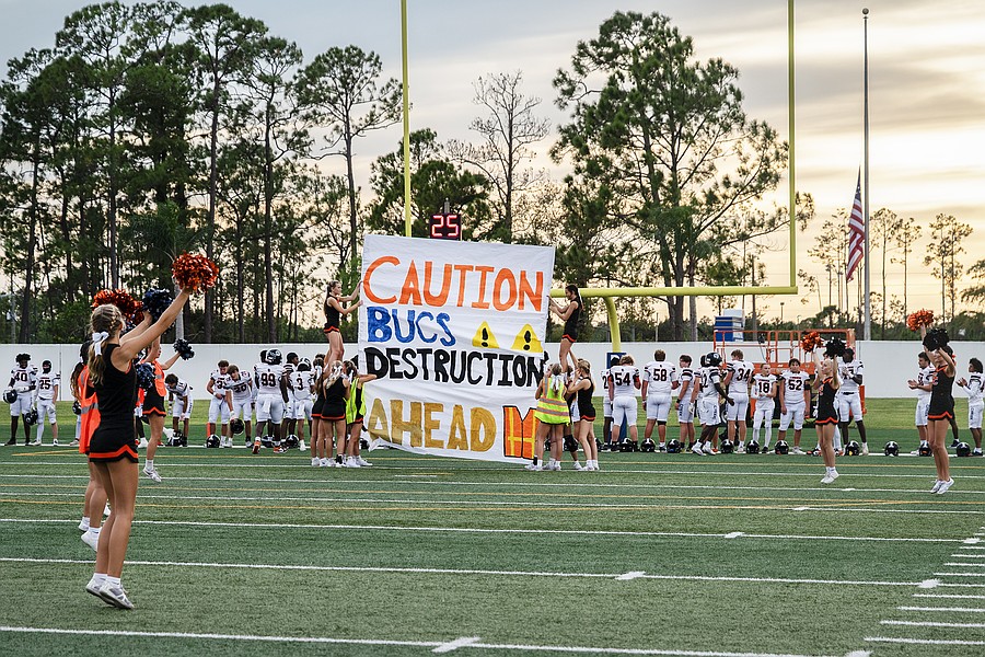 Spruce Creek cheerleaders and football team kickstart the game against Mainland on Friday, Sept. 12 at the Daytona Stadium. Photo by Michele Meyers
