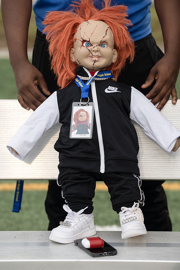 Chucky occupies a bench on the sidelines during the Mainland-Spruce Creek game on Friday, Sept. 12 at the Daytona Stadium. Photo by Michele Meyers